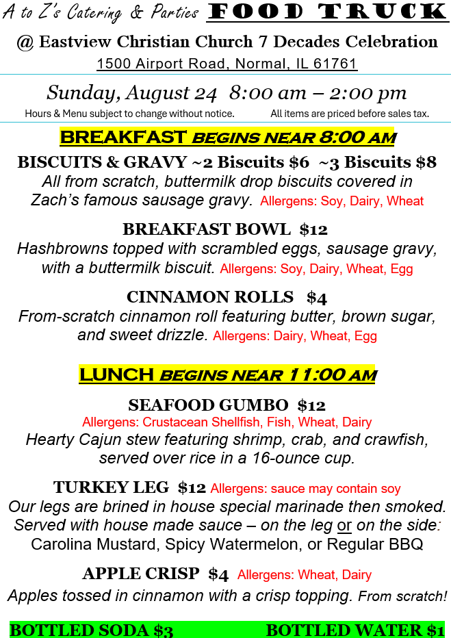 Find us at Eastview Christian Church for breakfast and lunch. We anticipate a large crowd, so will be there until the food runs out 🙂