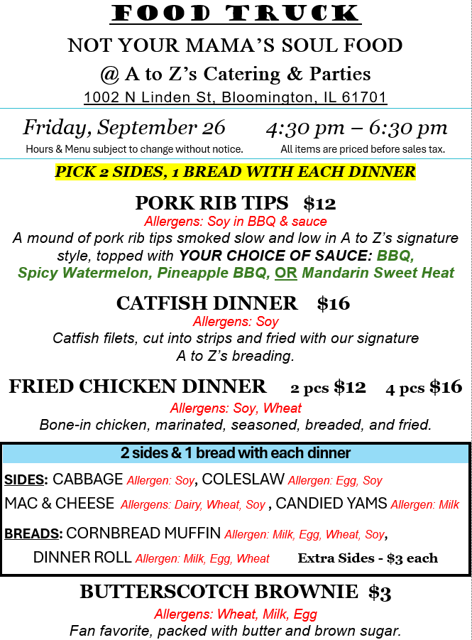 SOUL FOOD TRUCK Friday 9/26 September 23, 2025 a to z's catering and parties We’re back with soul food this Friday evening! Swing by 1002 N Linden St, Bloomington, and grab some of your favorites. . Share this: Click to share on X (Opens in new window) X Click to share on Facebook (Opens in new window) Facebook Like Loading... Related