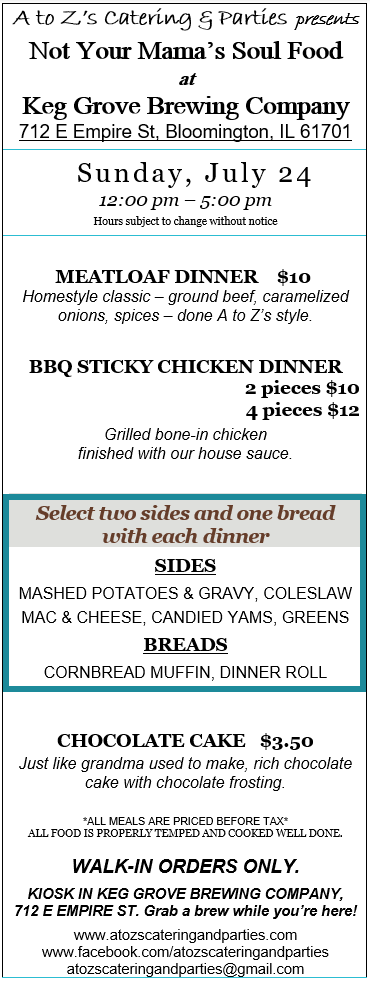 Sunday, August 7, 12:00 PM to 4:00 PM, come to Keg Grove Brewing Company (712 E Empire St, Bloomington, Illinois 61701, United States). We will be selling soul food and KGBG will provide their tasty brews.